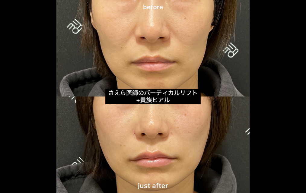 バーティカルリフトでは、頬の内側に糸を挿入し、下垂した脂肪を内側から持ち上げることでほうれい線を改善します。さらに、頬の脂肪を持ち上げた状態で、貴族ヒアル(鼻翼基部)にヒアルロン酸を注入して土台のボリュームを補うことで、ほうれい線の影をより目立ちにくくすることができます。